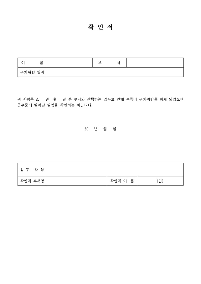 공무로 인해 부득이 주차위반을 하였음을 해당 업무 부서에서 확인해주는 확인서입니다.