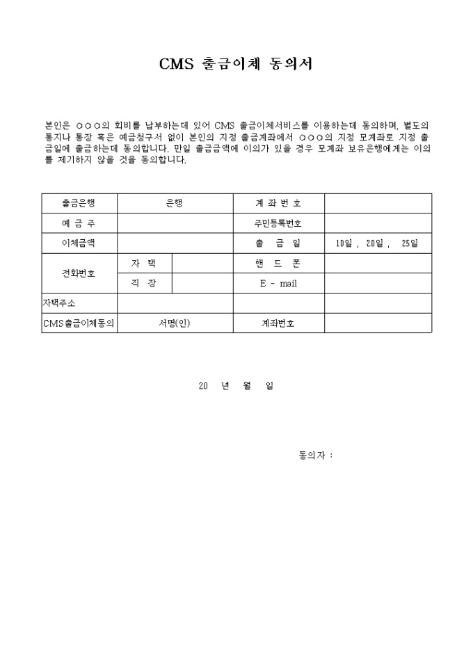 9,000원/월출금이체될 내역과 동의확인서명을 받는 CMS 출금이체 동의서입니다.