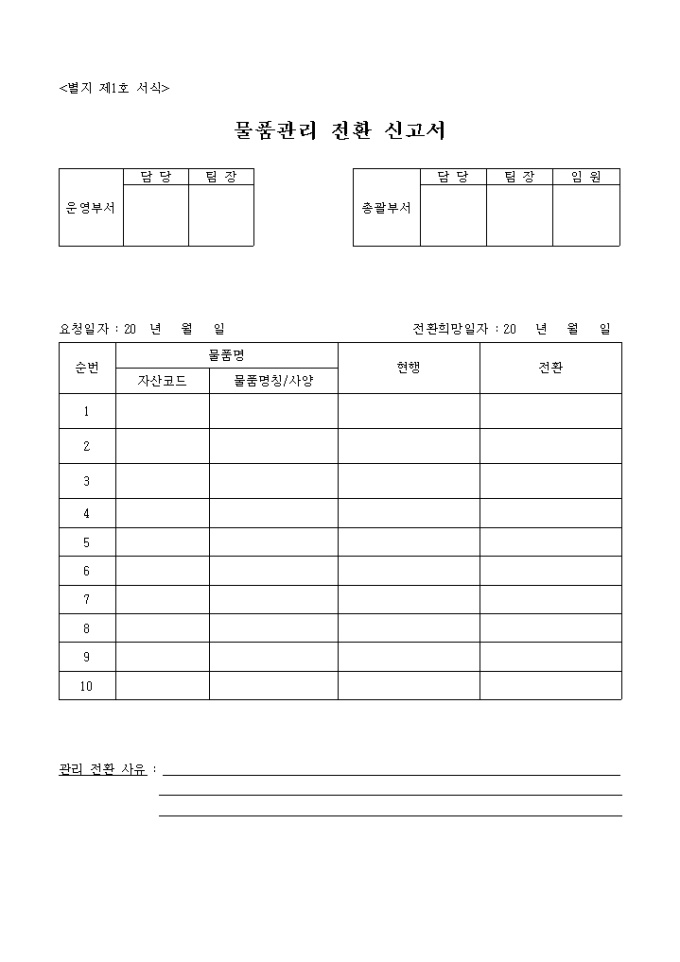 9,000원/월자산관리규정 의 별지1호 서식입니다. 물품명별 코드나 명칭, 사양, 현행 전환내역들을 기재하도록 됭 있습니다.