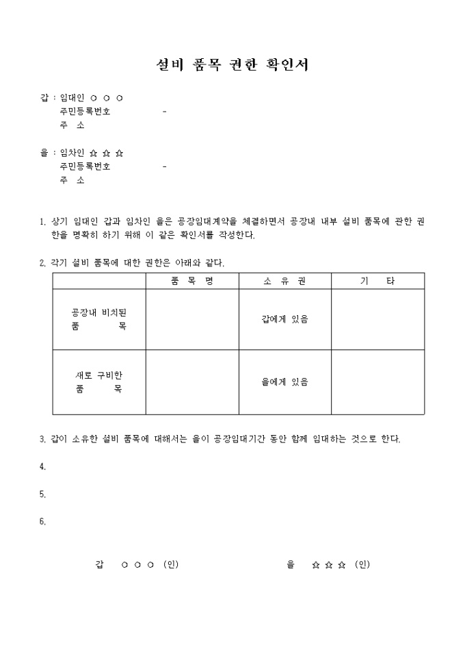 9,000원/월공장 임대시 공장내 기존에 있던 설비 품목과 임차인이 새로 구매한 설비품목의 권한을 명확히 할 때 사용하는 양식입니다.