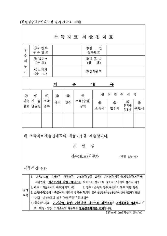소득자료 제출집계표(원천징수사무처리 규정 별지 제27호)(2004.09.01)