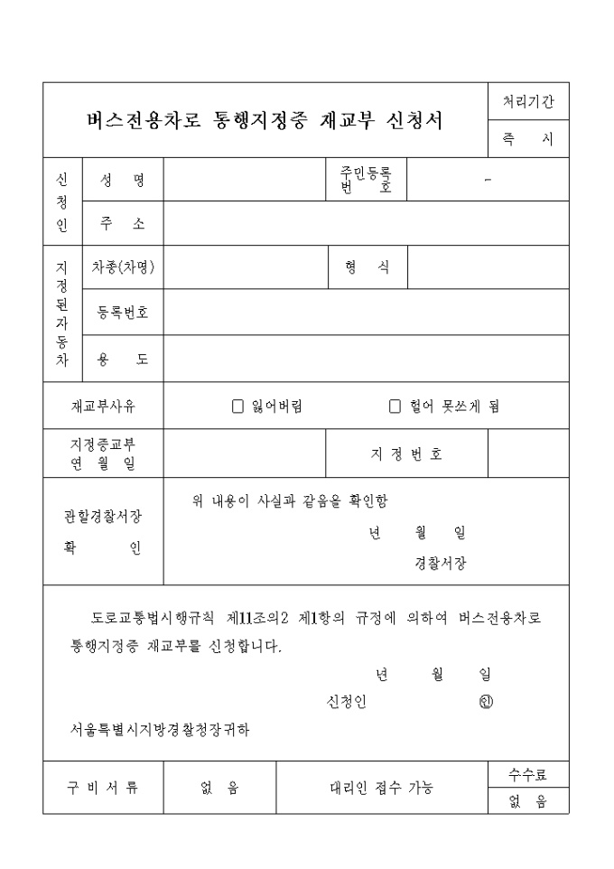 (교통)버스전용차로 통행지정증 재교부 신청서