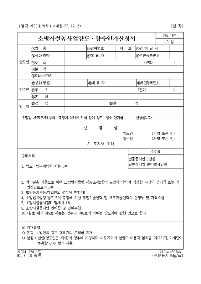 9,000원/월소방법 제55조제1항의 규정에 의하여 위와 같이 양도․양수 인가를 신청할 때 사용하는 "소방시설 공사업 양도,양수 인가신청서" 양식입니다.