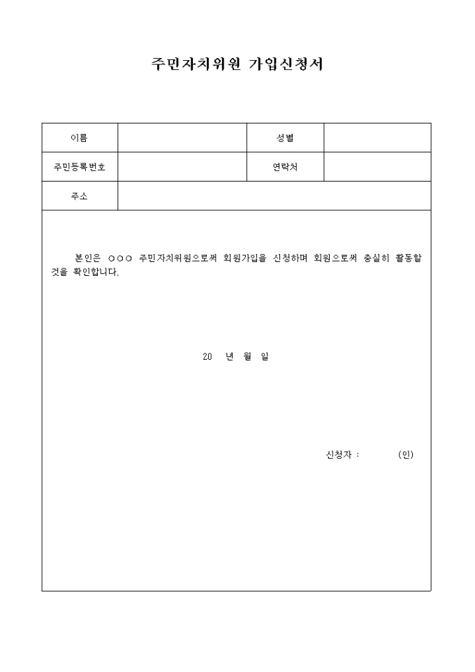 9,000원/월가입자 인적사항을 기재하고 주민자치위원으로 가입신청과 함께 성실히 활동함을 확인하는 내용입니다.