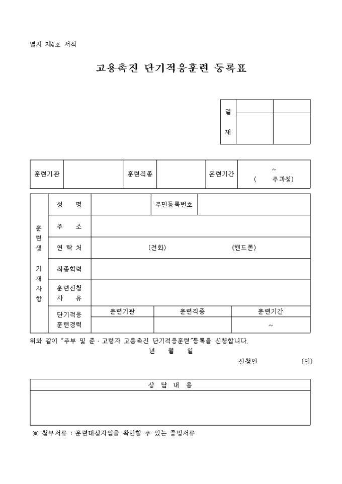 고용촉진단기적응훈련 등록표(수강신청)