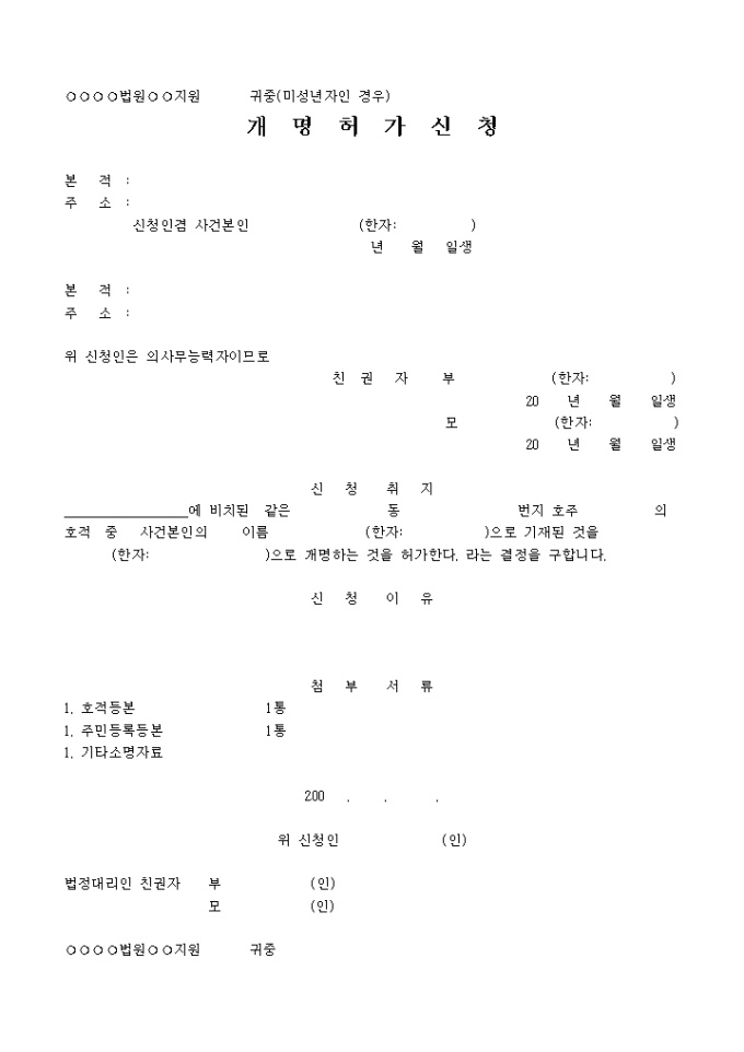 9,000원/월가정법원에 개명신청시 사용하는 기본 양식입니다. 내용은 직접 기재를 하셔야 합니다.