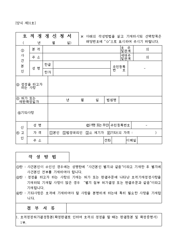 호적법 별표 양식 제31호 호적정정신청서