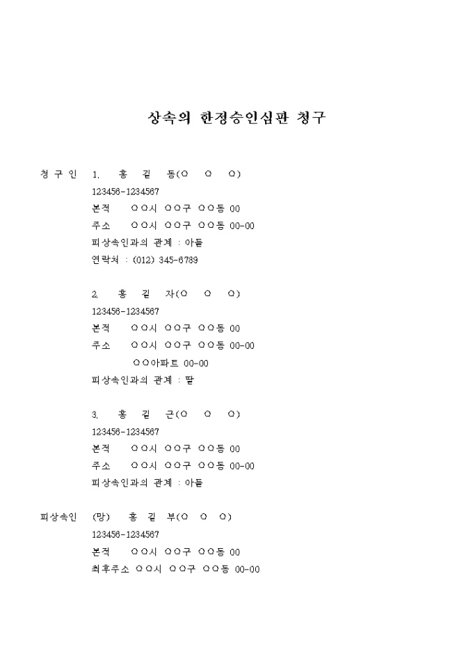 9,000원/월조합에서 빌린 채무금이 있음을 사망후 3개월 이내에 알지 못하여 단순승인을 한 경우에 다시 한정승인을 구하는 심판을 청구할때 사용하는 서식입니다.