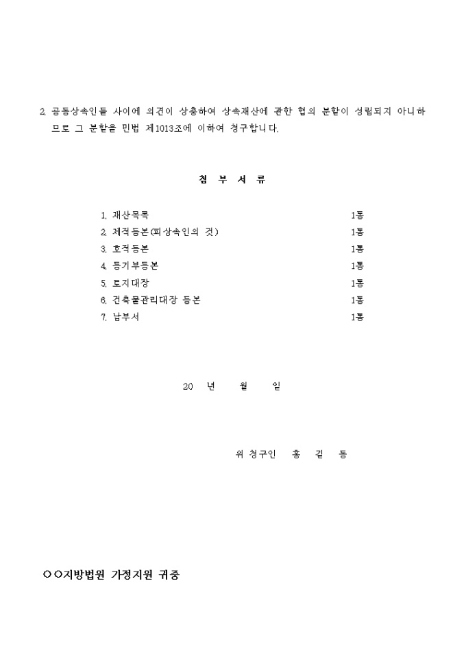 공동상속인들 사이에 의견이 상충하여 상속재산에 관한 협의 분할이 성립하지 않아 법원의 심판을 구하는 경우에 사용하는 서식입니다.
