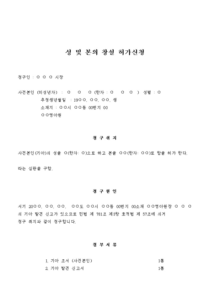 성을 알지 못하는 기아의 성을 창설하는 경우에 사용하는 서식입니다.