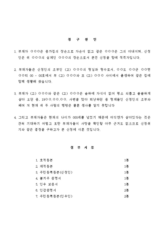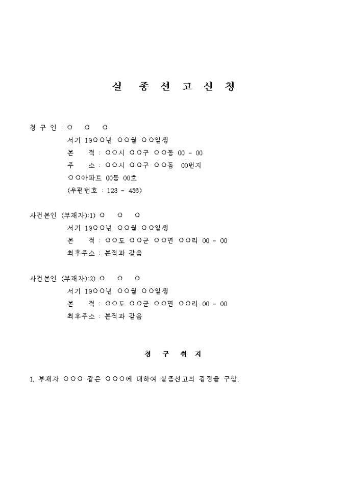 9,000원/월6.25 당시 실종된 사람의 실종선고를 청구하는 서식입니다.