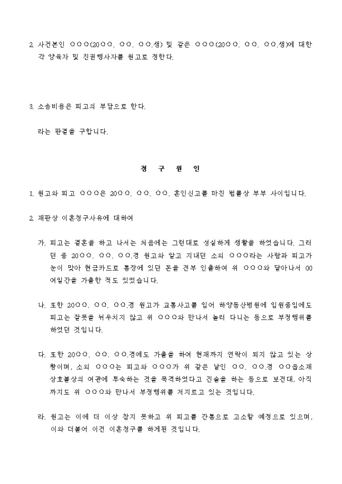 9,000원/월당사자 일방의 간통을 이유로 이혼신청을 할 때 사용하는 서식입니다.