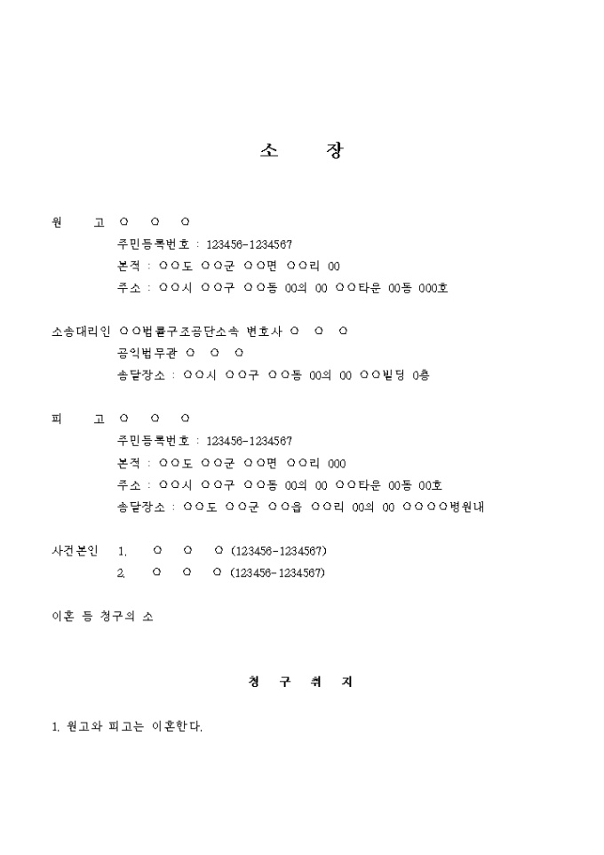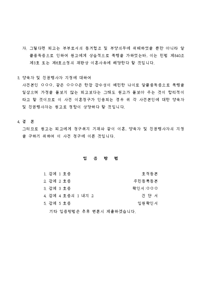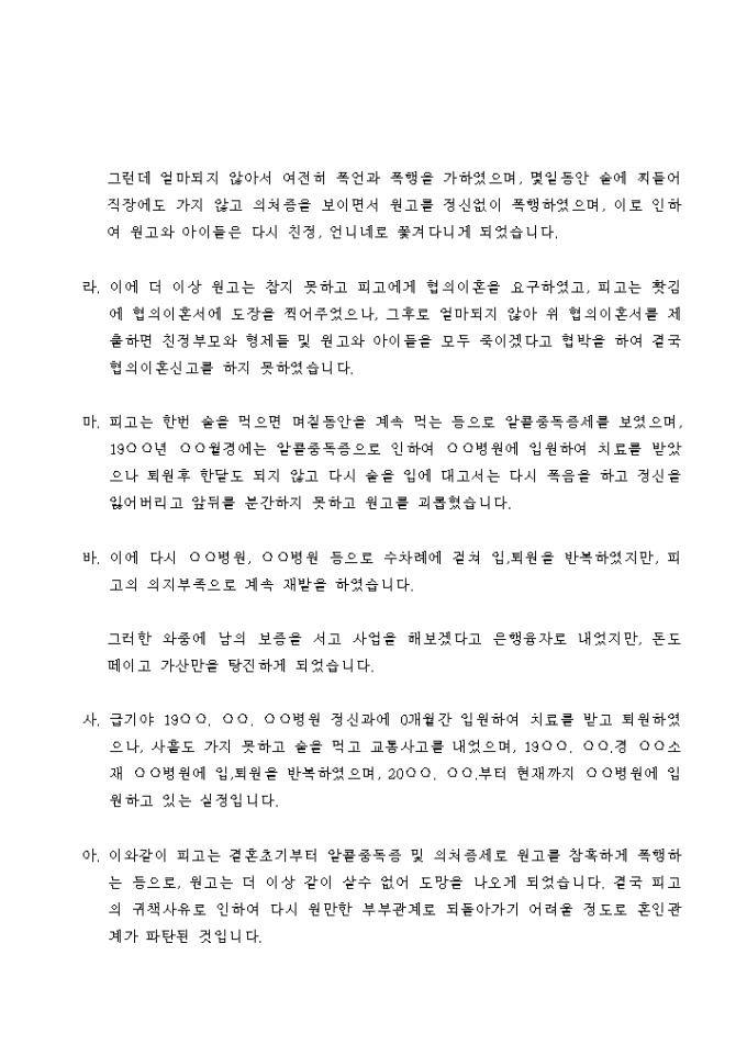 남편의 알콜중독 및 의처증세를 이유로 이혼하는 경우에 사용하는 서식입니다.