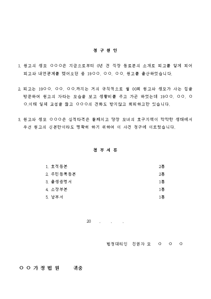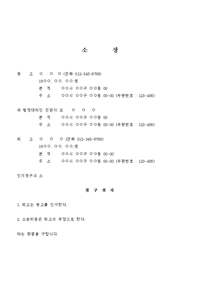 9,000원/월혼인외의 자가 자신이 부의 자인것을 인지해 줄 것을 청구하는 서식입니다.