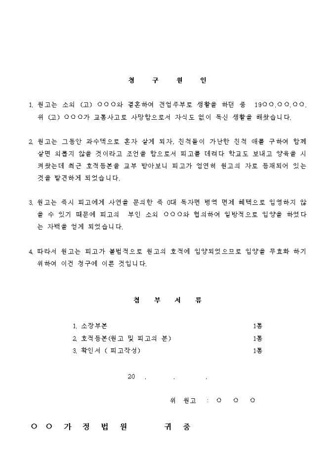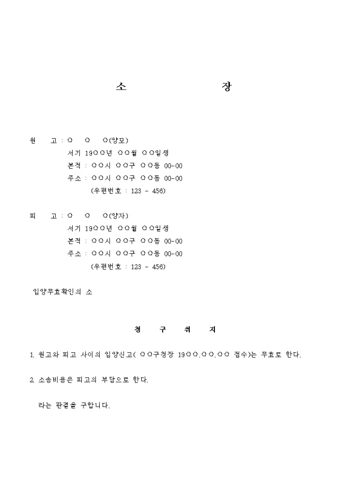 피고의 일방적인 호적신고로 양친자관계가 된 경우에 이것의 무효를 주장하는 서식입니다.