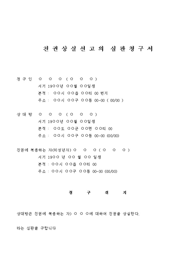 9,000원/월생모인자가 가출하여 친권을 행사하지 못하므로 사건본인의 백부가 생모의 친권상실을 법원에 구하는 서식입니다.