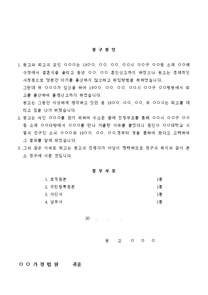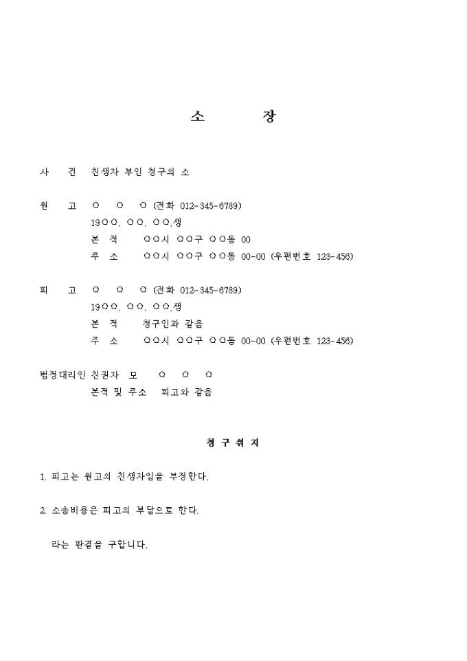제3자와 부인과의 사이에서 낳은 자를 자신의 친생자로 등재되어있는 것을 정정하기위해 친생자부인의 소를 제기하는 경우의 서식입니다.