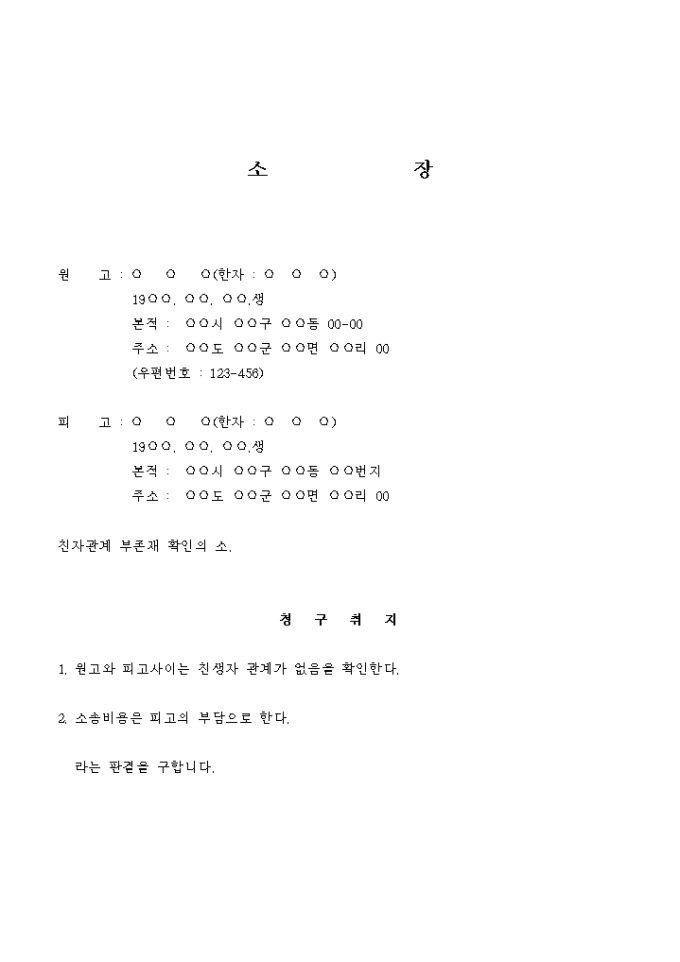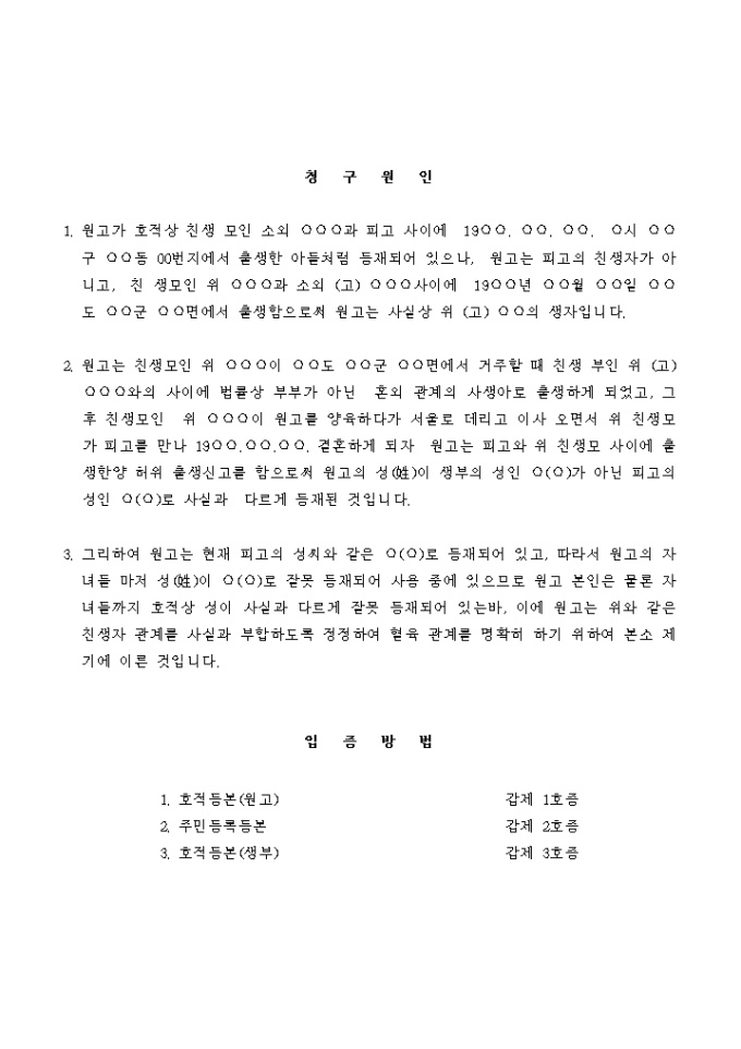 9,000원/월의붓 아버지의 친생자로 호적에 등재되어 있는 것을 정정하기위해 친자관계부존재확인의 소를 제기 하는 경우에 사용하는 서식입니다.