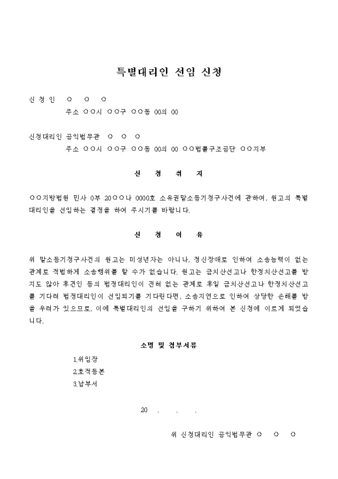 9,000원/월미성년자가 당사자인 민사소송을 수행하기 위해 특별대리인을 선임하고자 할 때 사용하는 서식입니다.
