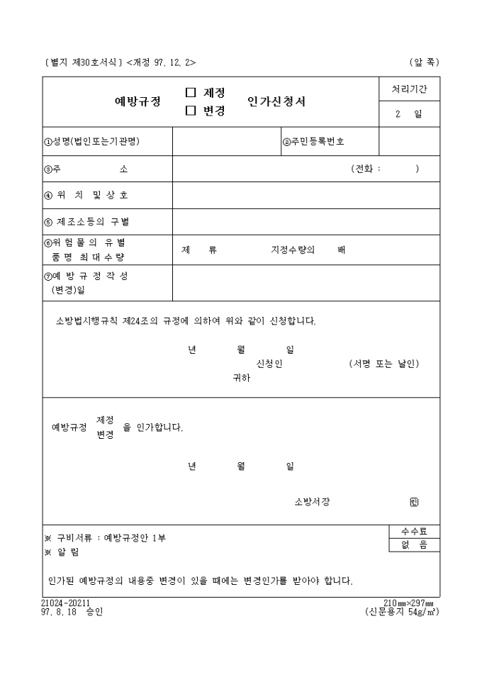 9,000원/월소방법시행규칙 제24조의 규정에 의하여 위와 같이 신청 / 인가할 때 사용하는 "예방규정 (제정,변경) 인가신청서" 양식입니다.