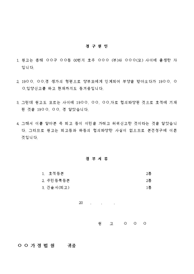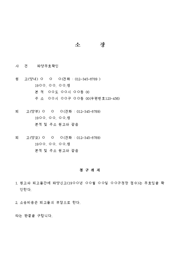 파양이 무효임을 확인하는 소송을 제기할 때 사용하는 서식입니다.