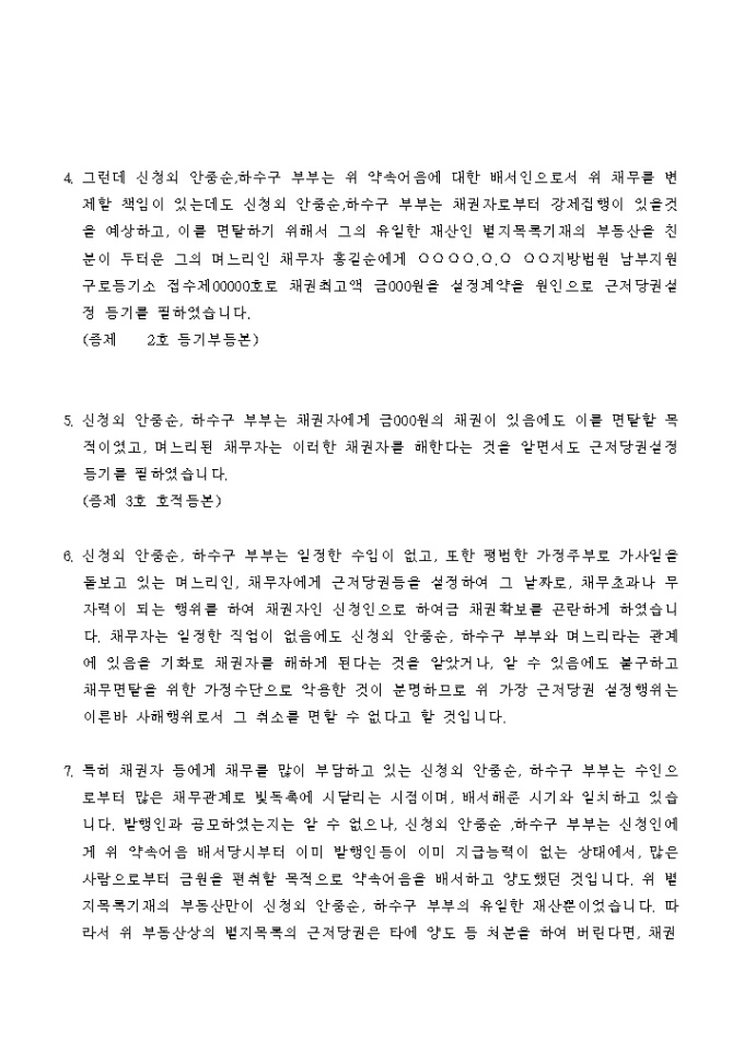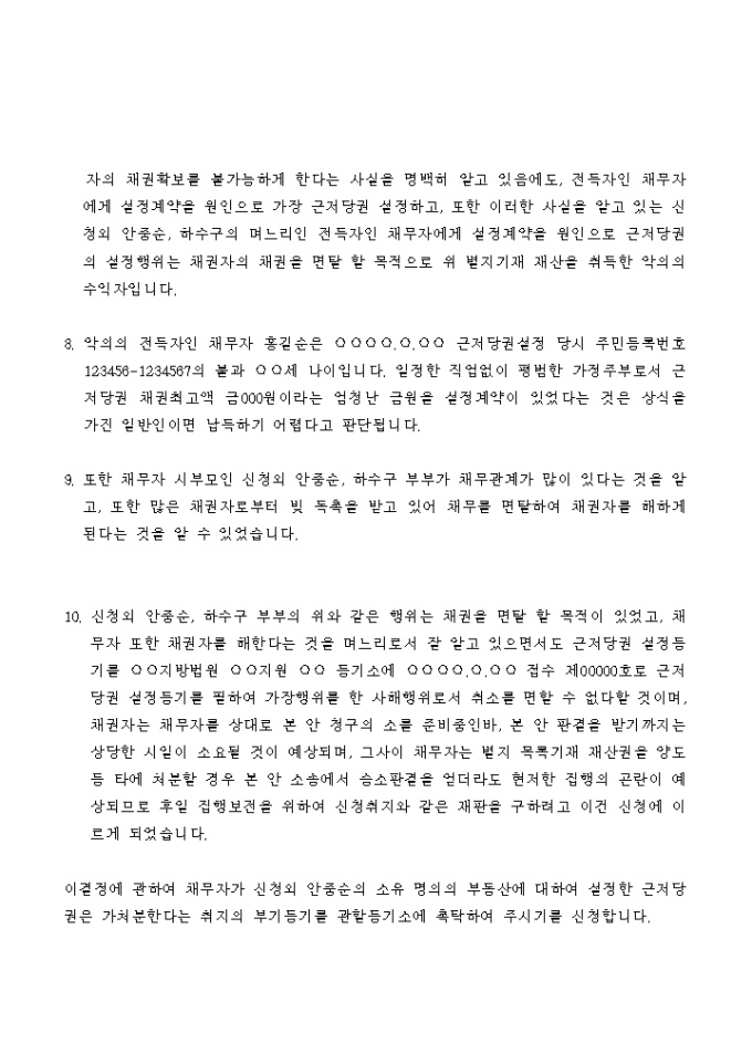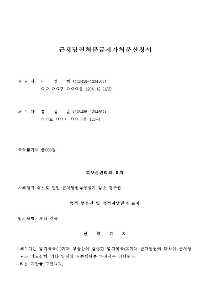 사해행위로 인한 취소권을 보전하기 위하여 근저당권처분을 금지하는 가처분을 신청하는 경우에 사용하는 서식입니다.