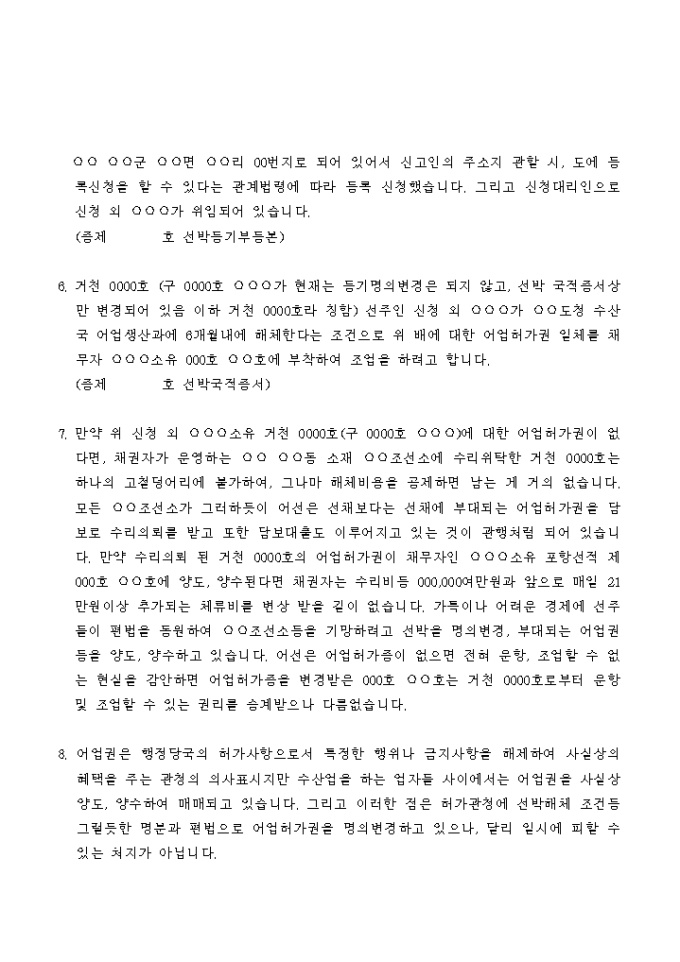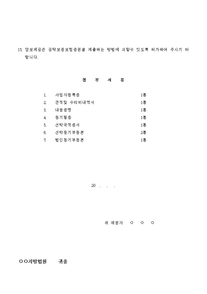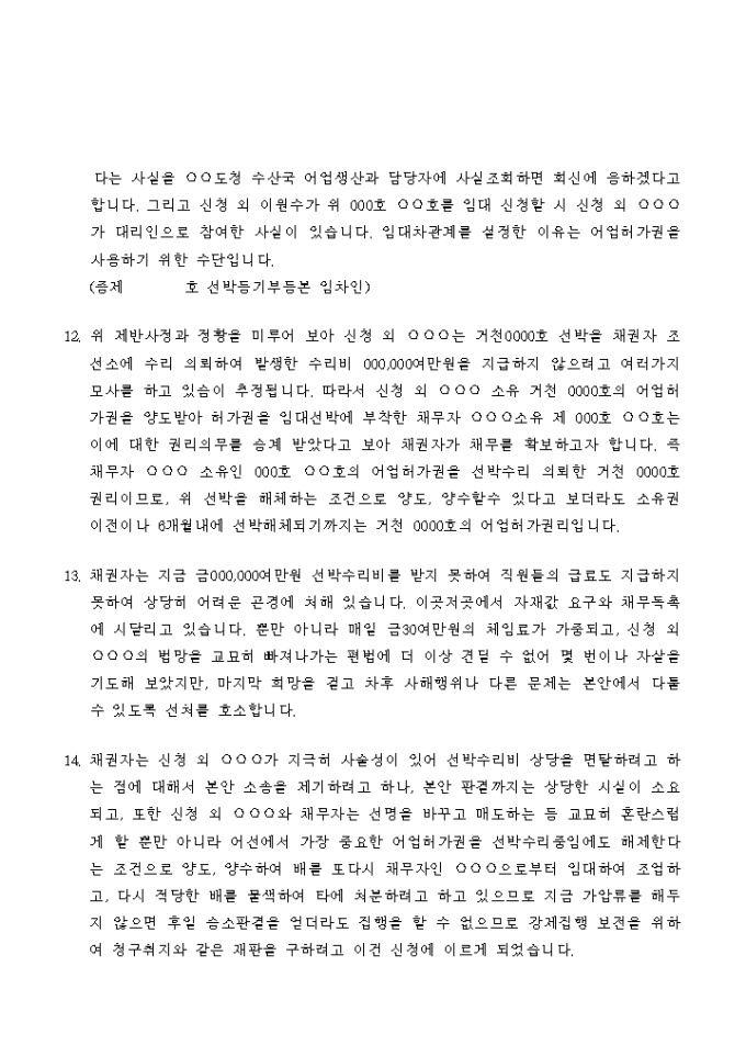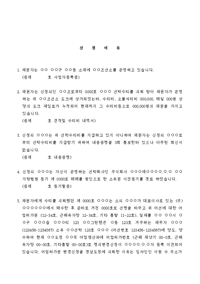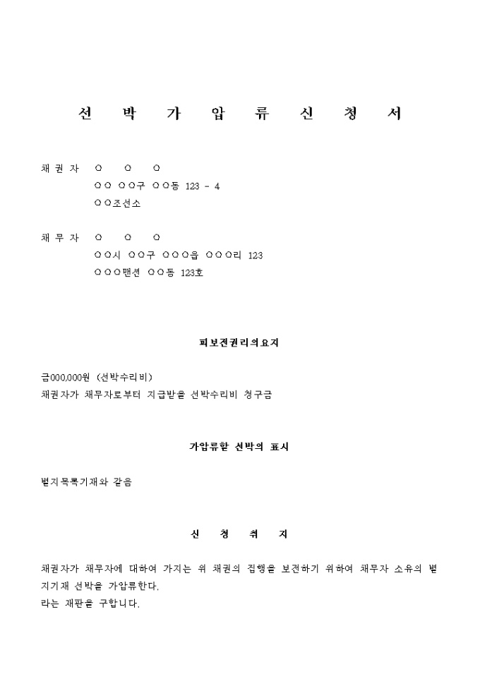 9,000원/월채권자가 채무자로부터 지급받을 선박수리비를 청구하기 위해 그 선박의 가압류를 신청하는 경우에 사용하는 서식입니다.