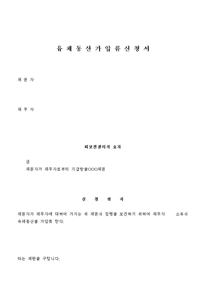 유체동산 가압류 신청서의 기본적인 양식입니다.