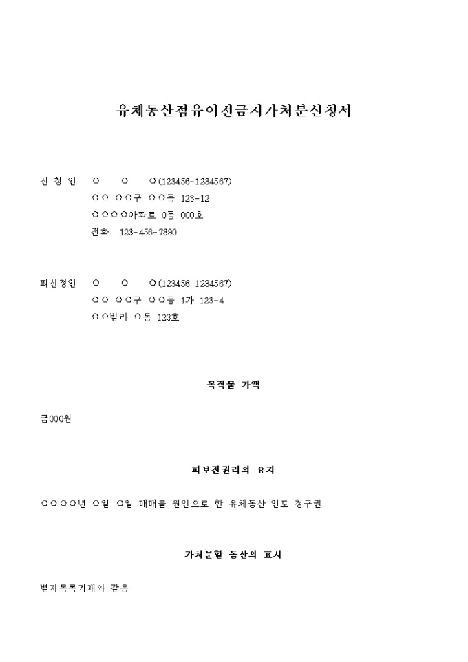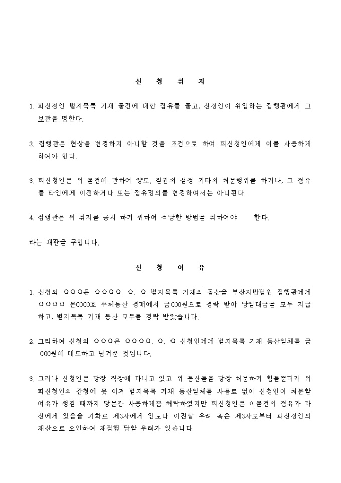 매매물건을 인도 받지 못한 경우에 그 물건에 대한 인도 청구권 보전을 위해 청구하는 유체동산 점유이전금지 가처분 신청서입니다.