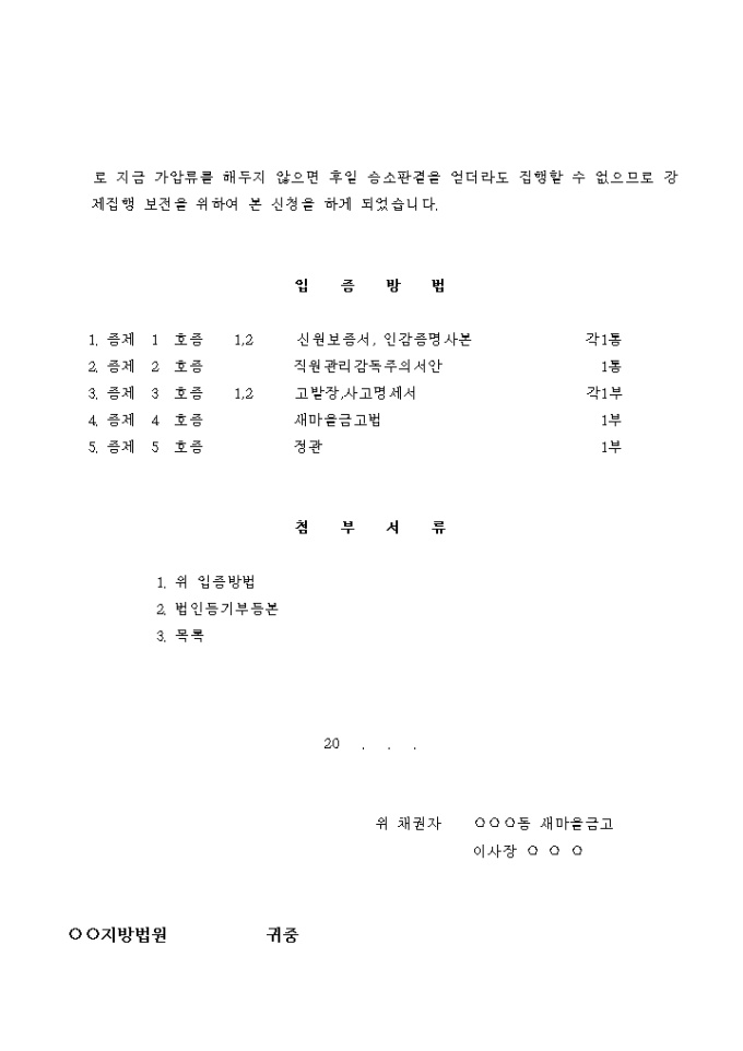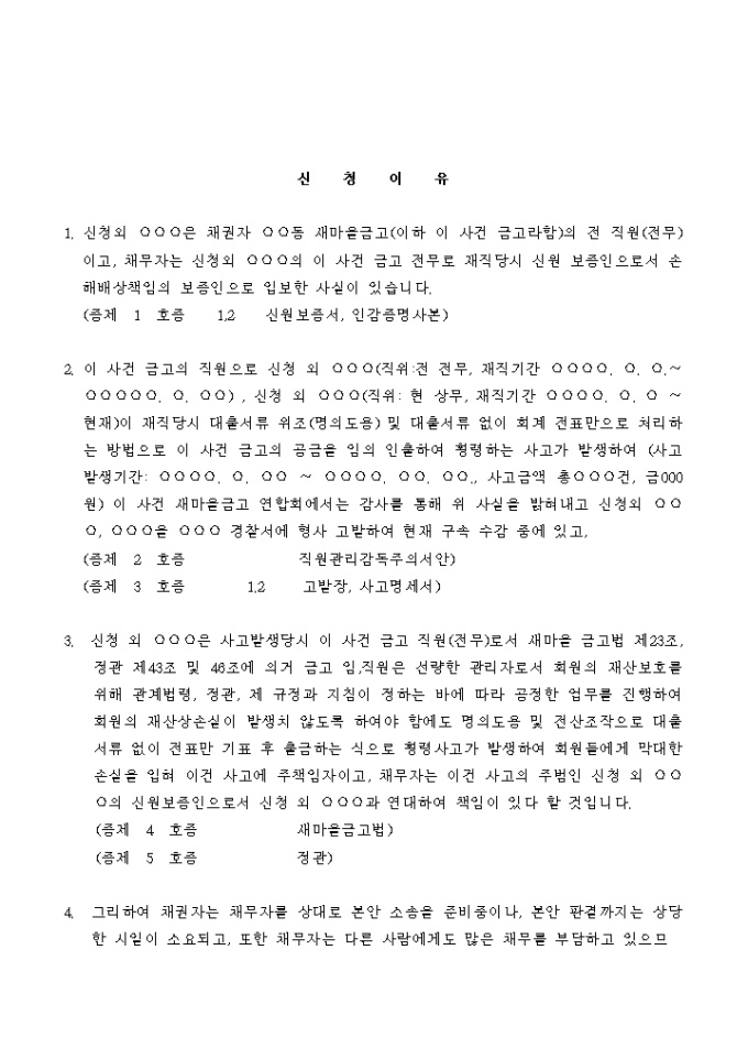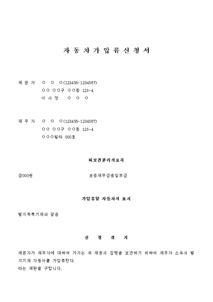 9,000원/월금고 직원의 신원보증인으로서의 임원이 가지는 보증채무금의 변제를 위해 자동차 가압류 신청을 할때 사용하는 서식입니다.