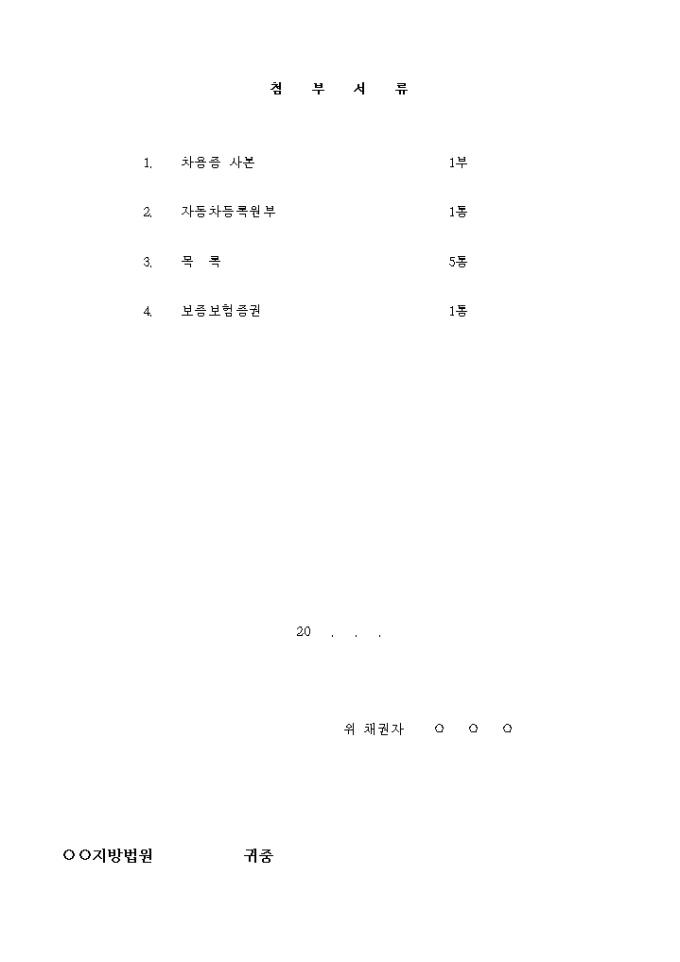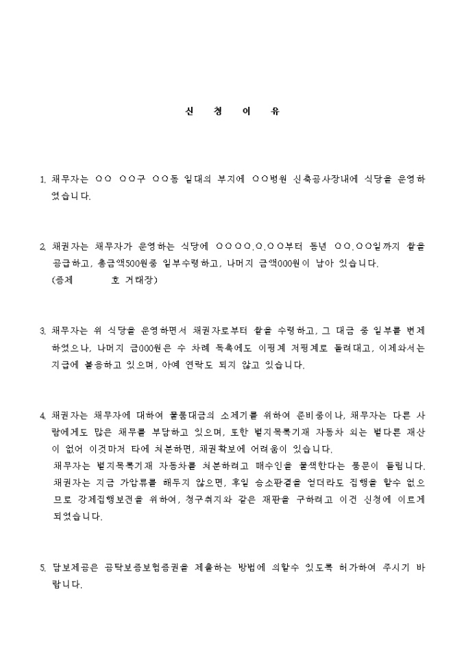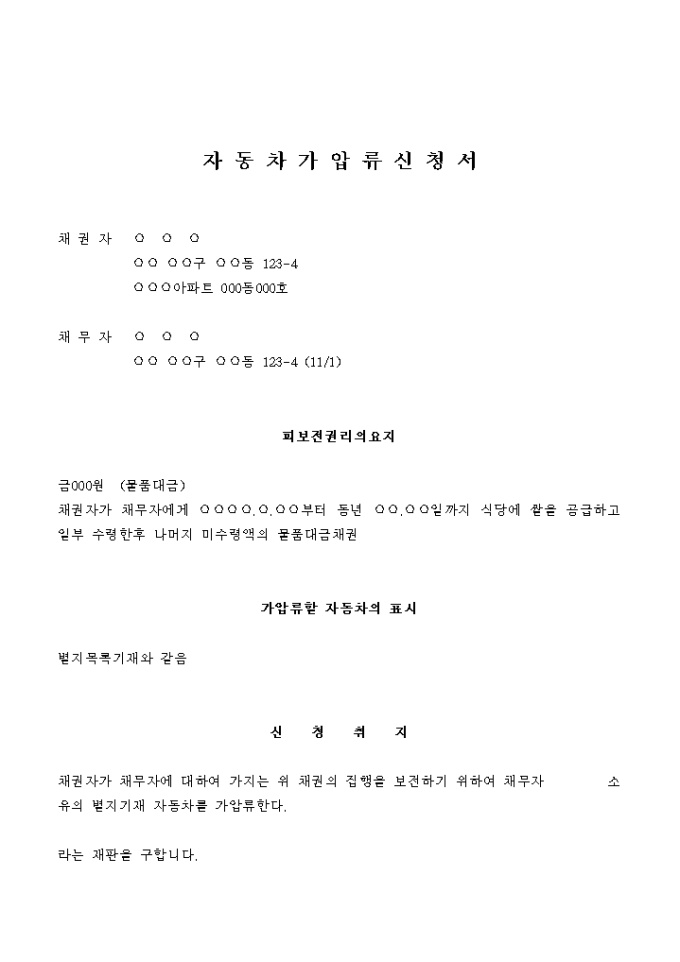 9,000원/월쌀을 공급하고 받을 물품대금으 변제를 보전하기 위해 자동차 가압류를 하는 경우에 사용하는 서식입니다.