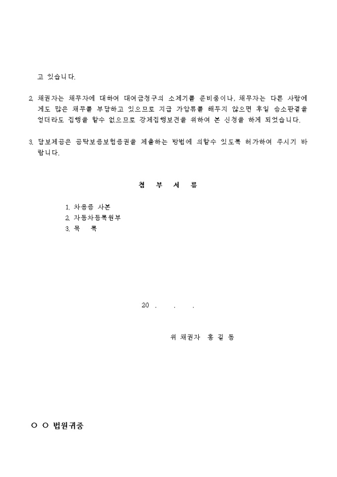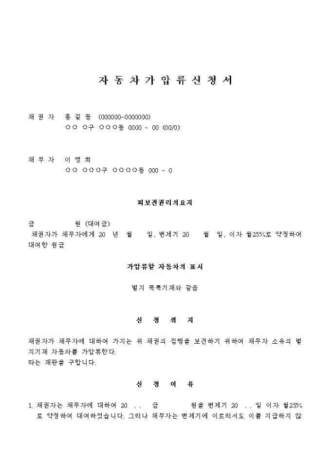 9,000원/월월 2할5푼의 이율로 대여한 대여금의 원금을 보전하기 위해 자동차 가압류를 신청하는 경우에 사용하는 서식입니다.