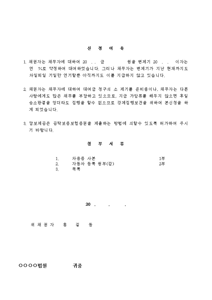 9,000원/월월 5푼의 이율로 대여한 대여금의 원금을 보전하기 위해 자동차 가압류를 신청할 때 사용하는 서식입니다.
