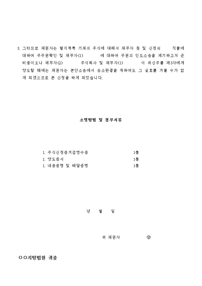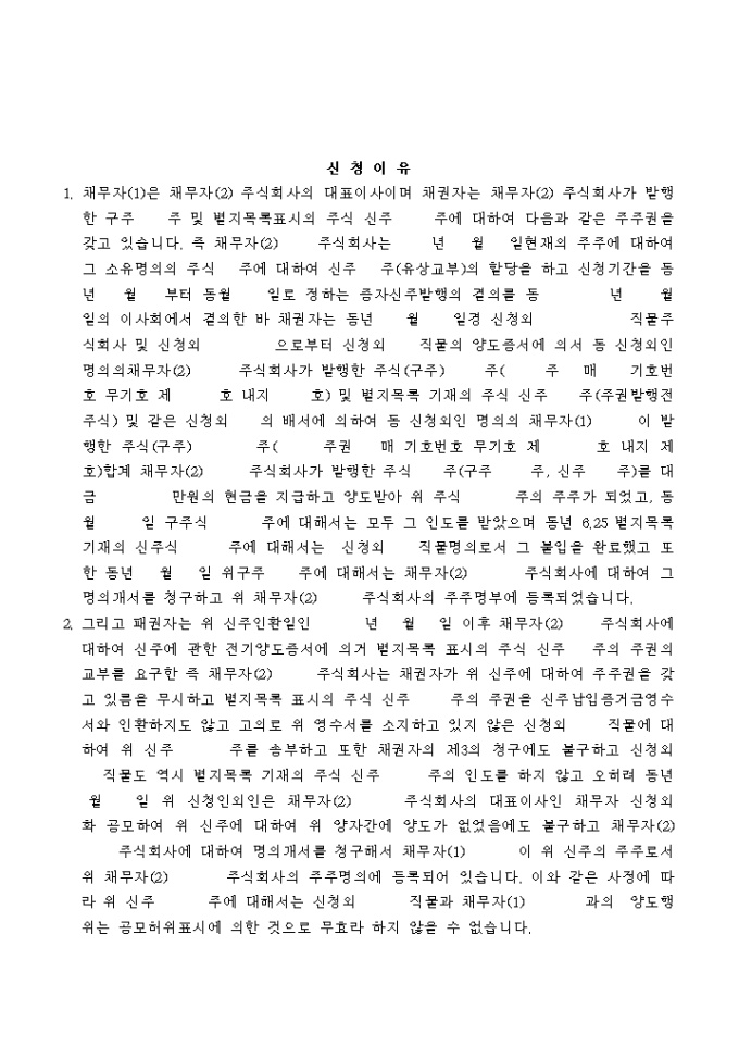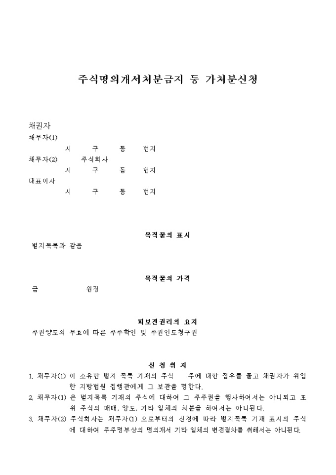 주권양도의 무효에 따른 주주확인 및 주권인도청구권을 보전하기 위해 주식명의 개서처분금지등 가처분신청 할 때 사용하는 서식입니다.