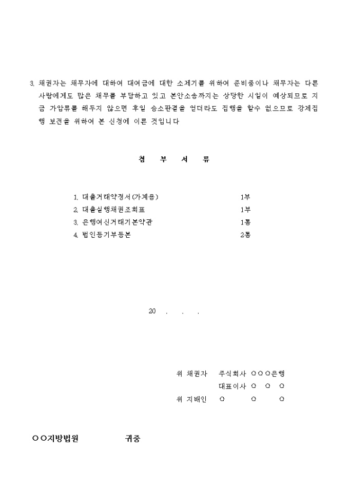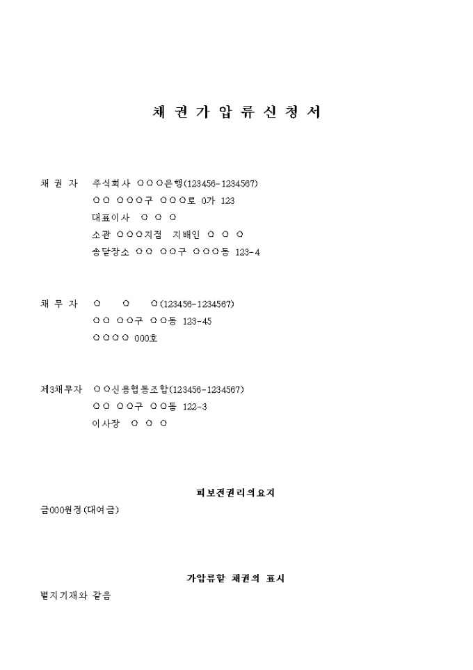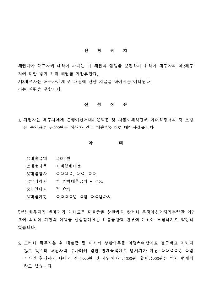 9,000원/월금융기관에서 대출한 금전을 갚지 못하여 금융기관이 채무자의 채권을 가압류 신청할 때 사용하는 서식입니다.