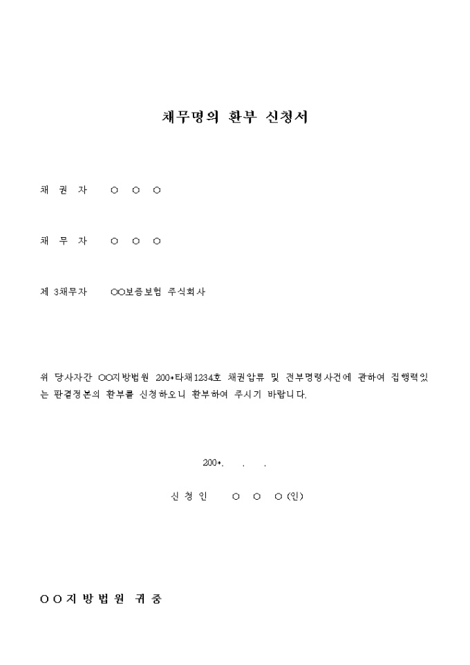 채무명의 환부 신청서 및 영수증