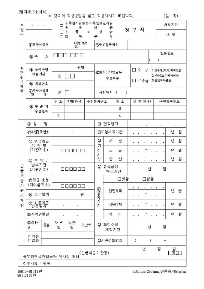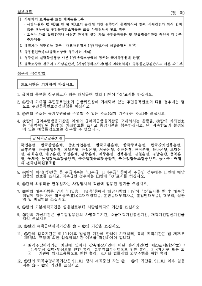 유족일시금또는 유족연금일시금, 유족연금, 유족보상금, 퇴직수당청구서
