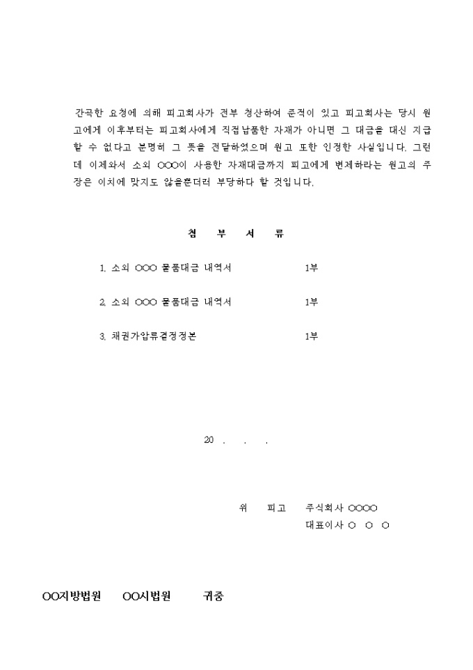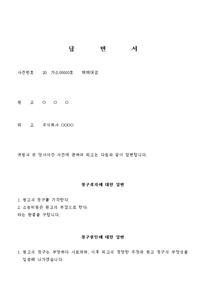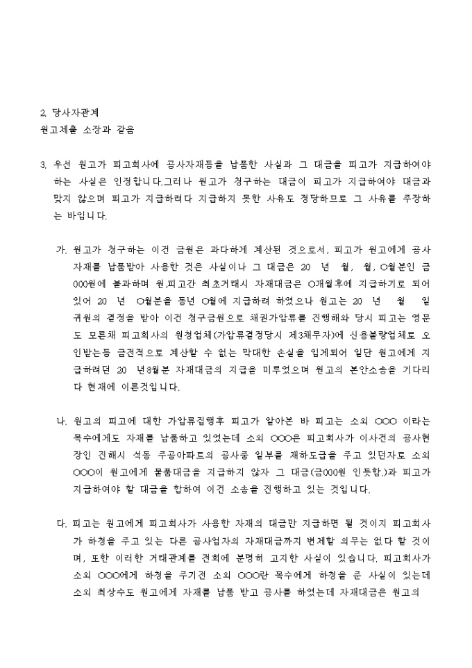 9,000원/월공사자재 납품에 대한 매매대금을 청구하는 원고의 주장에 대해 그 사실은 인정하나 지급지 않는 정당한 이유가 있음을 주장하는 피고의 답변서입니다.