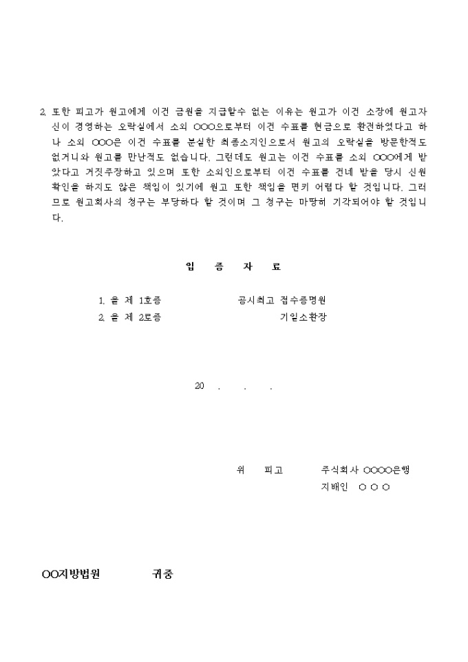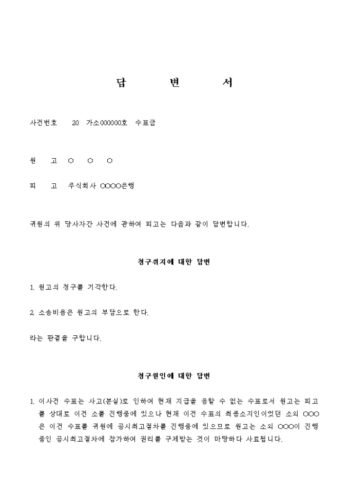 9,000원/월원고의 수표금 청구소송에 대해 피고가 답변하는 서식입니다.