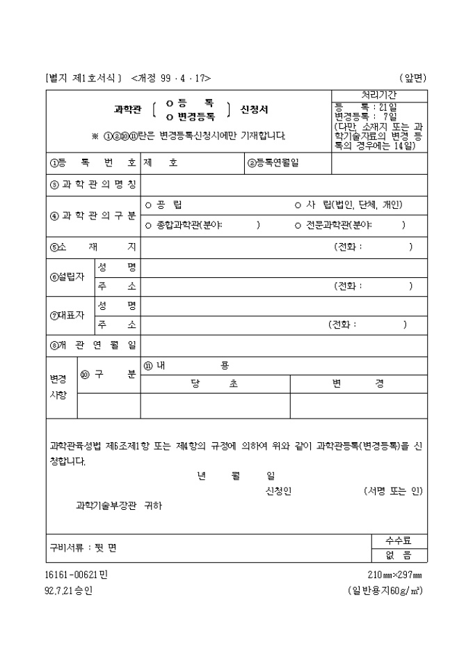 사립과학관 등록(변경등록)신청서(별지 제1호서식)