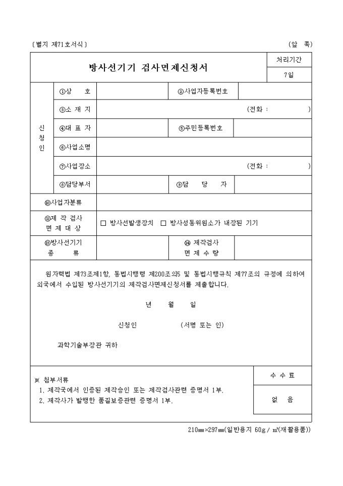 방사선기기 검사면제신청서(별지 제71호서식)
