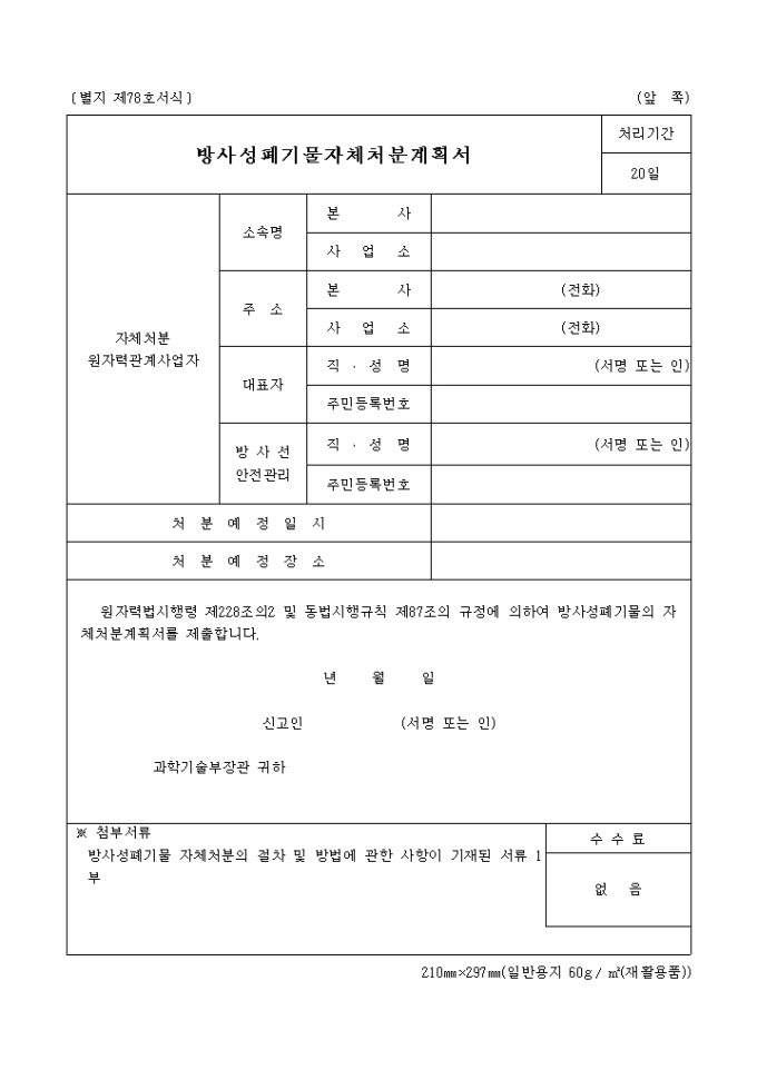 9,000원/월방사성폐기물을 폐기하기 위한 계획서로 폐기날짜, 장소를 기입하는 칸으로 구성되어 있으며 방사성폐기절차에 대한 서류가 필요합니다.