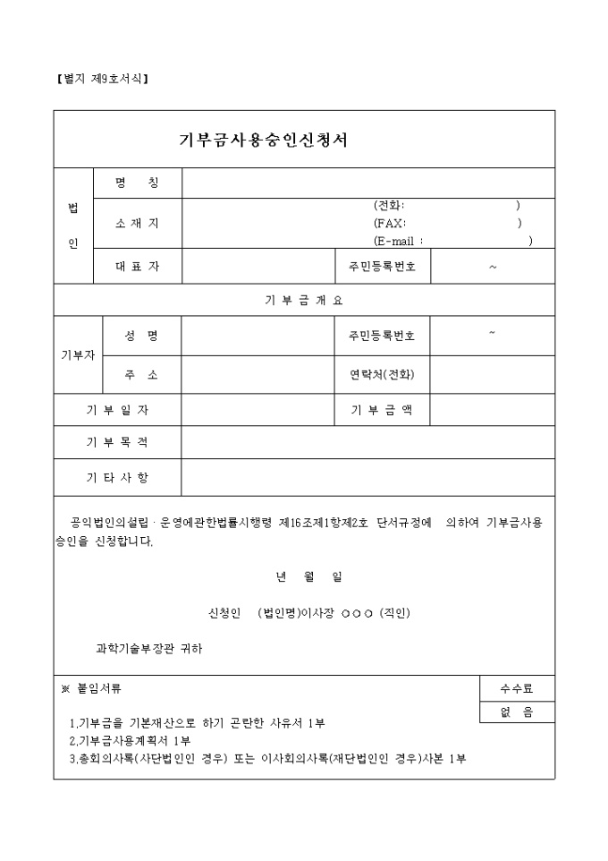 9,000원/월기부금에 대한 사용 승인 신청서로 기부금의 기부일자, 기부목적, 기부사항에 대해 작성하는 칸으로 구성되어 있습니다.