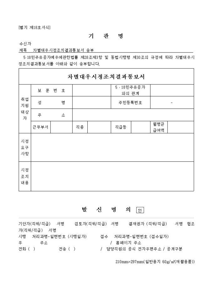 9,000원/월취업보호대상자의 차별 대우 시정 조치 결과 통보서입니다. 취업보호대상자의 신상명세를 기입하는 칸과 시정요구사항, 시정 조치사항을 기입하는 칸으로 구성되어 있습니다.