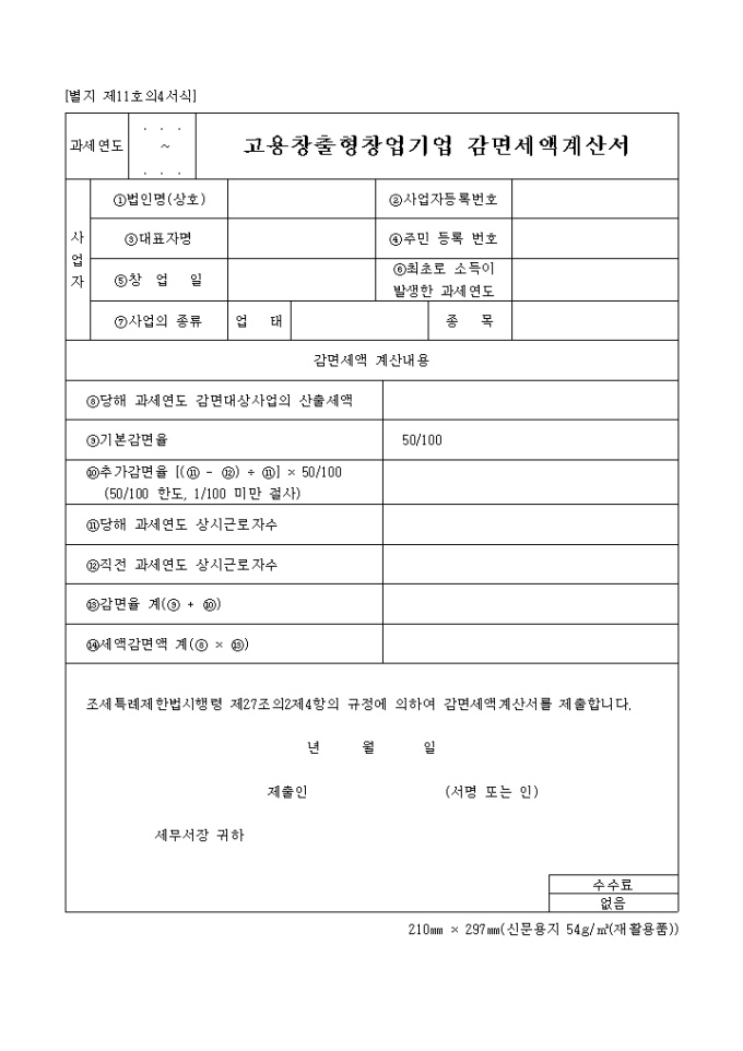제11호의 4서식은 고용창출형 창업기업에 대해 세액을 감면하기 위한 계산서입니다.