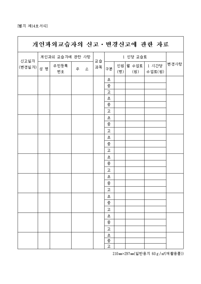 14호 서식은 개인과외 교습자의 신고 병경신고에 관한 자료로서 신고일자, 개인과외 교습자에 관한 사항, 교습과목, 1인당 교습료를 기입합니다.