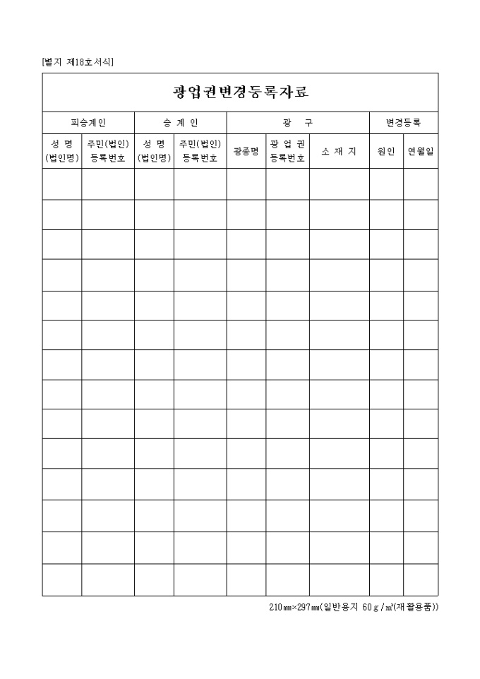 18호서식은 광업권변경등록자료로서 피승계인, 승계인, 광구, 변경등록을 기입합니다.