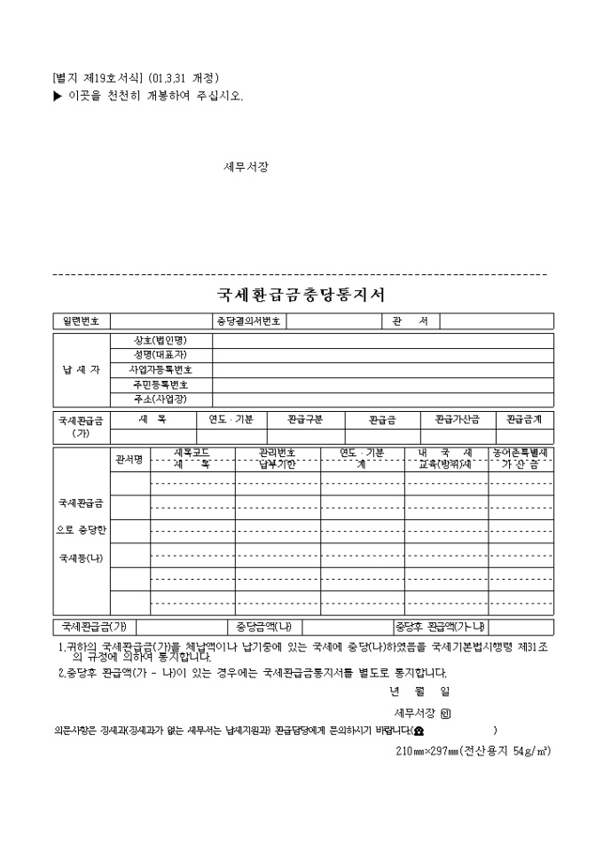 19호 서식은 국세환급금 충당 통지서로서 국세환급금을 체납액이나 납기중에 있는 국세에 충당하였음을 알리는 서식입니다.
