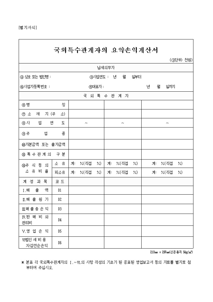 별지 1호서식은 국외 특수 관계자의 요약 손익계산서로서 관계자의 신상명세와 금액을 기입합니다.