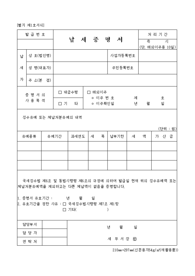9,000원/월별지 1호서식은 납세증명서로서 납세자의 신상명세와 증명서의 사용목적, 징수유예 또는 체납처분유예의 내역을 기입합니다.